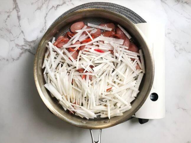 4、翻炒出香味后加入白萝卜丝进去翻炒。