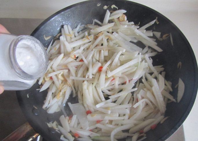 5、翻炒至白萝卜丝透明且发软后加入盐调味。
