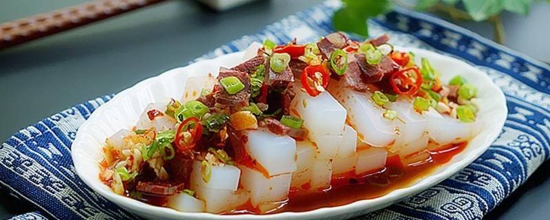 凉粉适量、洋葱一颗、大蒜3~4瓣、辣椒1~2根、葱花适量、生抽2~3汤匙、白糖1勺、盐三分之一勺、醋1勺、鸡精少许、郫县豆瓣酱1勺。