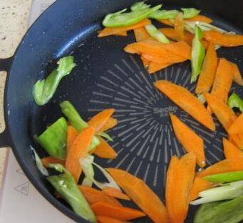 热油爆葱花锅,炒辣椒和胡萝卜片。