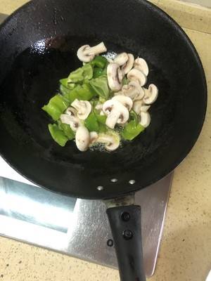 2、锅中加入油烧热后,倒入青椒和蘑菇翻炒。