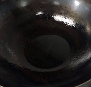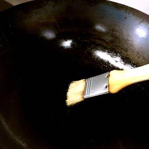 6、热锅凉油,开大火烧热,有点儿冒烟儿时,改小火。
