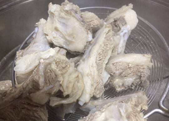 4、羊排放入冷水锅大火煮开2分钟,撇掉浮沫捞出控水。