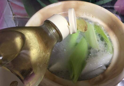 6、将焯好水的羊排倒入开了水的汤煲内,加葱、姜味达美臻品料酒煮开。