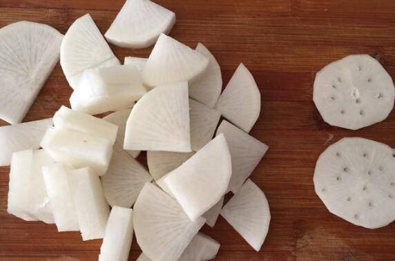 2、白萝卜去皮,先切出2个厚片用筷子扎些小孔,其它的切成薄一点的厚片。