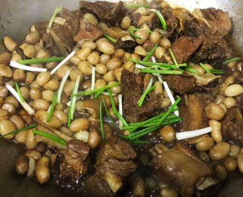 最佳答案花生米200克、排骨400g、油30g、姜片3片、糖20g、盐3g、葱两根、水700ml、老抽5ml、醋10g。花生用开水烫一下,烫去外皮红色,排骨焯水后沥干待用。起油锅,放入姜片,再放入细砂糖、排骨,进行翻炒。翻炒几次,加入水,大火烧开。放入花生米,转小火慢煮,一直煮到水差不多收干。放入小葱,盖盖子焖...