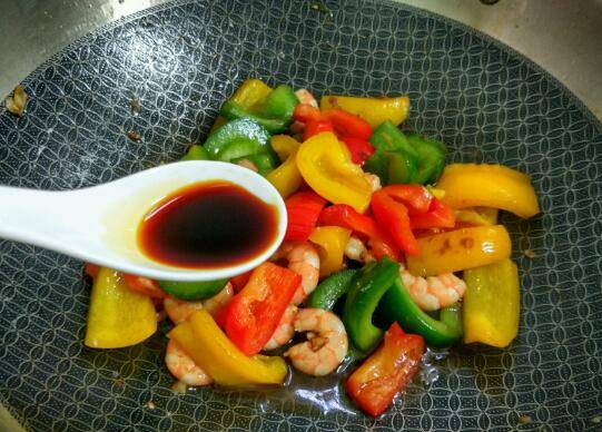 用料:虾250克、青椒半个、红椒半个、黄椒半个、大蒜2瓣、盐1小勺、鸡精半小勺、蚝油半勺、酱油半勺、植物油适量。