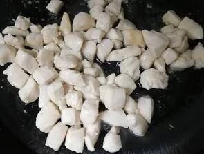 4、将鸡丁煸炒至变色盛起备用。
