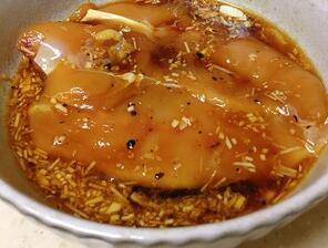 2、鸡胸肉洗净切大片,加入蒜末、生抽、蛋清、橄榄油、黑胡椒白糖盐抓匀,放冰箱静置一晚。
