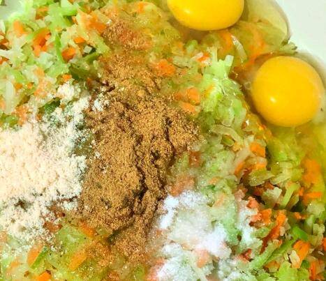 青萝卜2个、红萝卜2个、盐少许、面粉适量、鸡蛋3个、胡椒粉适量、十三香适量、食用油适量、鸡精少许。