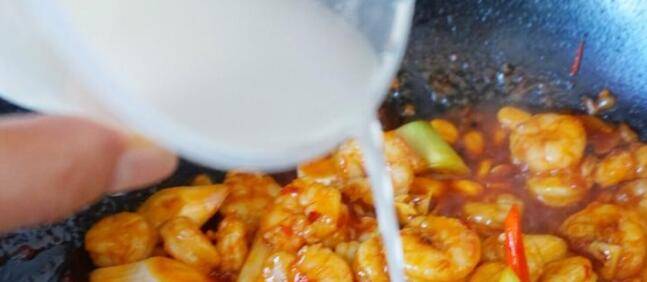 5、热锅冷油爆香除香菜和小米辣外的所有配料,然后拨到一旁,倒入混合酱,略炒一下后倒入处理好的虾,放少量盐(口淡的也可以不放,因为有酱也是),适量糖,快速翻炒,两分钟左右。