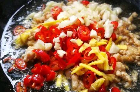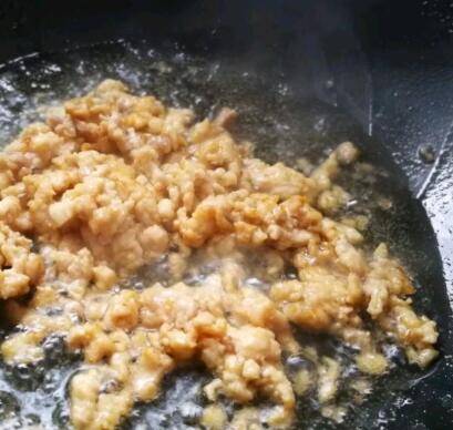 锅里热油,下肉沫快速划散,大火翻炒至肉末变色。