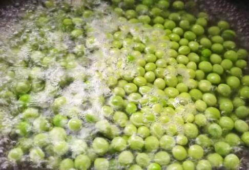 趁腌肉末期间,锅里烧水至沸腾,倒入豌豆焯水15秒左右。