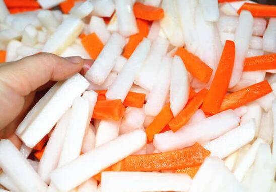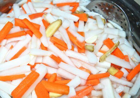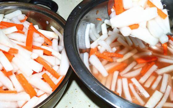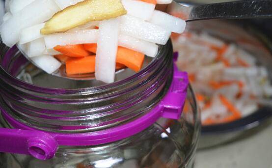 将白、红萝卜和调料汁水一起装进事先洗干净的玻璃罐中;将玻璃罐盖子盖好,然后放在阴凉的地方,腌5-7天左右,就入味了。期间可以把萝卜条翻两次,防止上面的萝卜条不够入味。