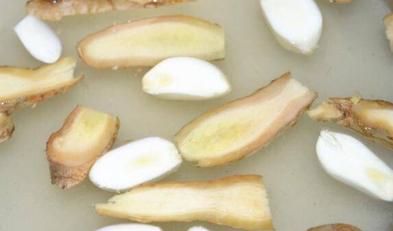 倒入事先准备好的凉开水,再把切好的大蒜、生姜片加入调料水中。