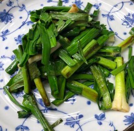 2.把大蒜叶的根部压扁,热锅下油,爆香后盛出。