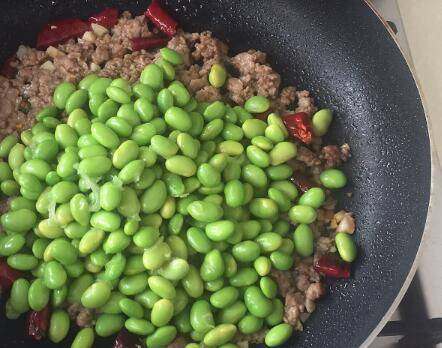 加入焯过水的毛豆继续翻炒,出锅前撒少许盐即可。