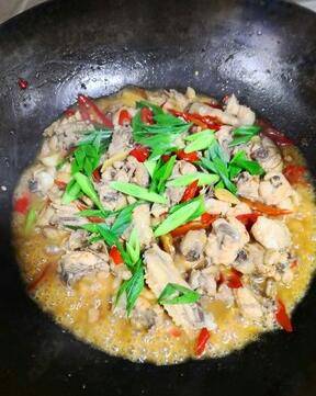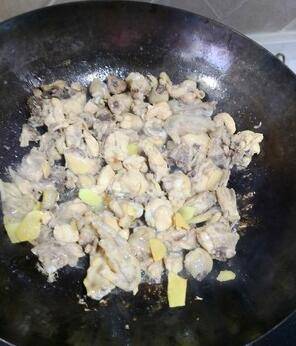 鸡块下锅,加盐适量,生抽一勺,小火炒香。