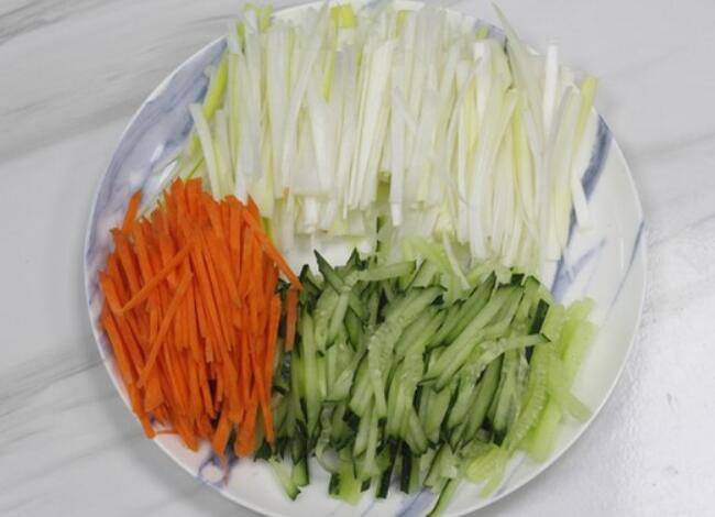 5.再来准备配菜,大葱、胡萝卜、青瓜都切成段然后切丝,这一步骤是考验刀工的时候啦 ,最好细一些。