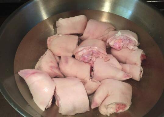 2、冷水下锅,水开出锅,目的是要把猪蹄里面的脏东西煮出来。