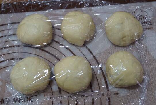 7、分成六个大小均匀的小面团,盖上保鲜膜静置15分钟。