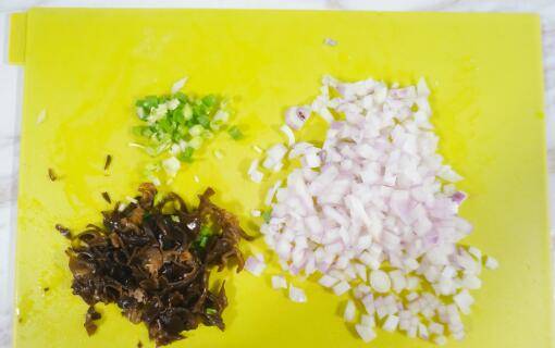 2、将洋葱切碎,木耳洗净切碎,香葱切碎。