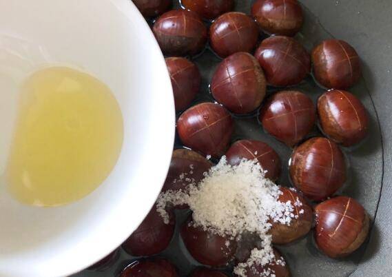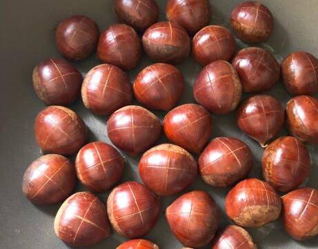 板栗清洗干净,用刀割出十字口,摆入锅中。