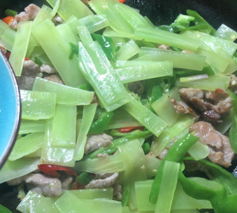 5、将莴笋片和辣椒一同倒入锅中,大火翻炒至莴笋软化。