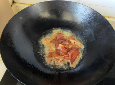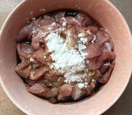 4、铁锅烧油,油温升起放入腌制好的肉片。