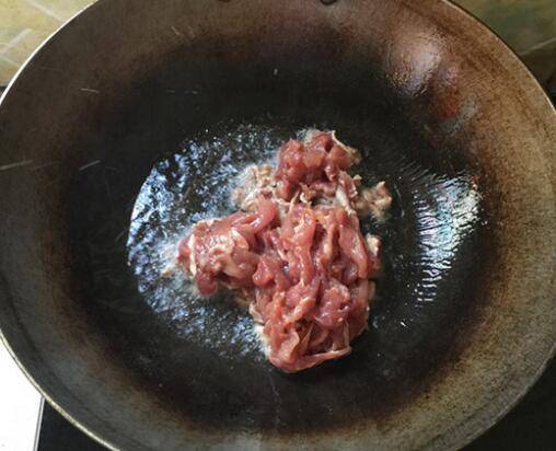 4、锅中注入食用油,5成热时下瘦肉,滑炒变色后盛出备用。
