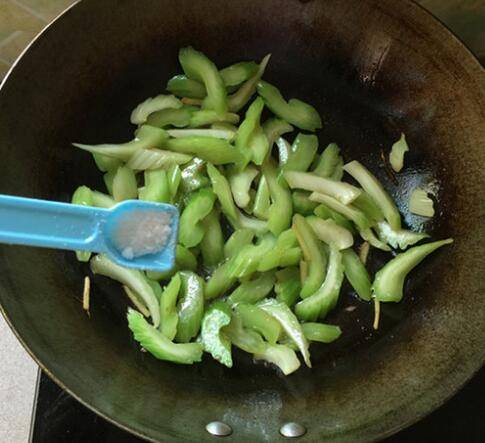 6、翻炒至芹菜略变色的时候加精盐。