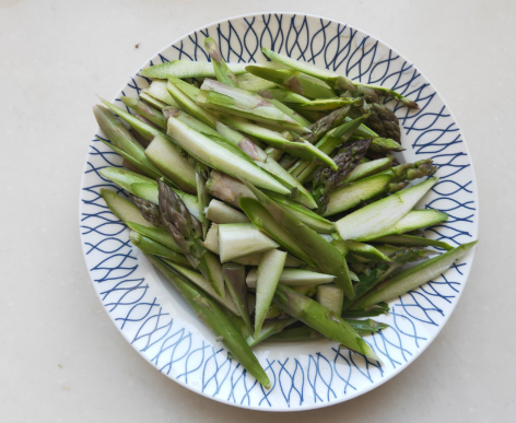 2、芦笋清洗干净切成滚刀片。