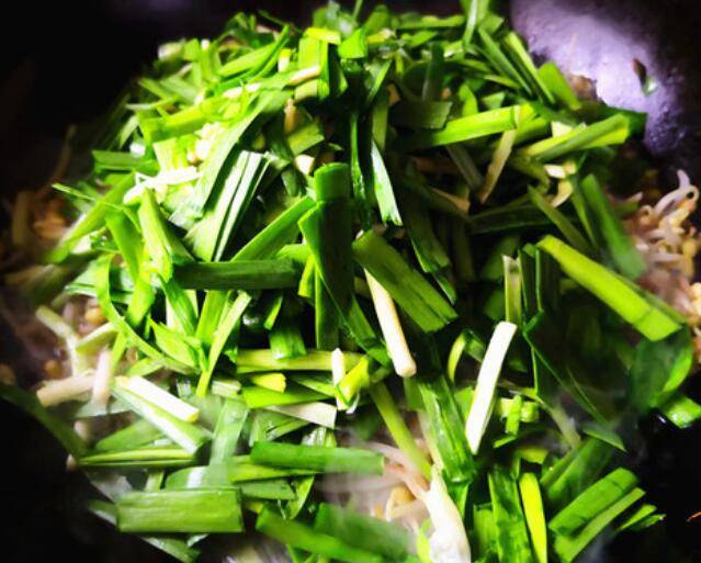 7.最后倒入韭菜翻炒,出锅前点一点米醋提鲜,味道更好。