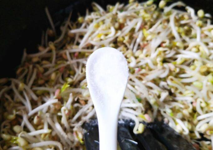 5.再把豆芽放入锅里快速翻炒,让每一颗豆芽都粘到油,当豆芽开始变化时放一勺盐,继续炒。