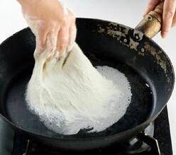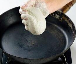 6、平锅用小火加热,抓一团面,反复抖动几次后按在平锅中快速抹出一个圆形薄饼。