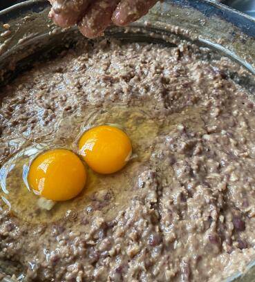 3、和好的肝泥内加入鸡蛋、十三香、花椒粉、八角粉盐再次搅拌均匀。