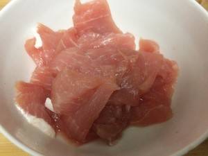 3、通脊肉比较瘦,适合做木须肉,切片,用少许盐和料酒腌制10分钟备用。