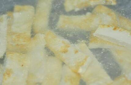 少许油,烧热,放入豆腐皮煎至两面焦黄色,装起,切成条。