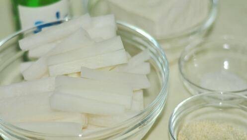 豆腐洗净,切片。萝卜洗净切条状。在碗里将盐1/4勺、米醋2勺、白砂糖1小勺、清酒2勺、生抽2勺混合,搅拌至白砂糖化开。