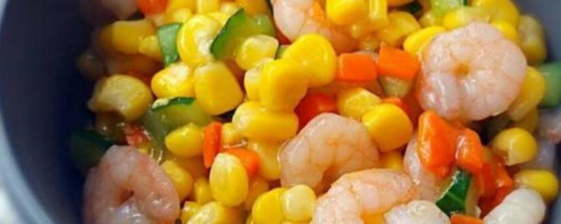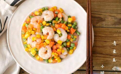 虾100克、玉米粒70克、青豆70克、胡萝卜50克、盐适量、鸡精适量、油20克。