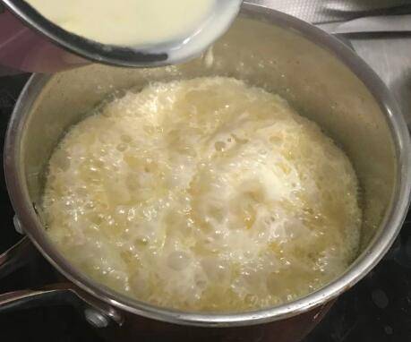 慢慢倒入煮开的鲜奶油,一定要慢慢倒,奶油容易扑出来。