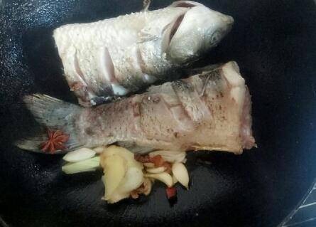 2、锅中放油,将鱼两面煎黄后将辅料放进去煸香。