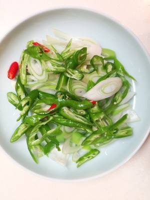 2、大葱切片、青椒切丝,可放一个朝天椒点缀。