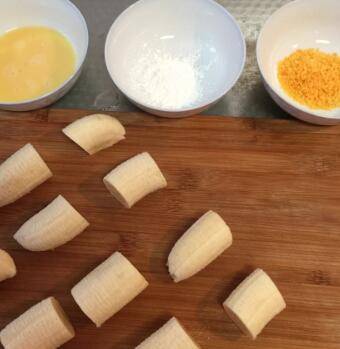 香蕉2个、鸡蛋1个、淀粉若干、面包糠若干、食用油适量。
