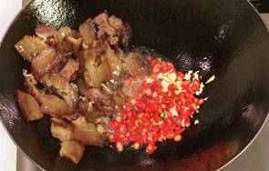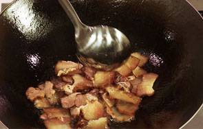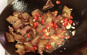 6、倒入腊肉。