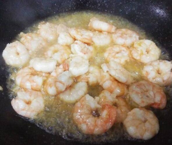4.锅中放油炒虾仁。