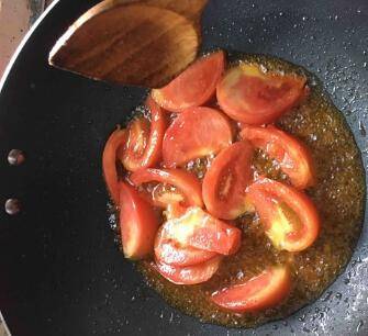 把番茄倒入热油中,翻炒融化。