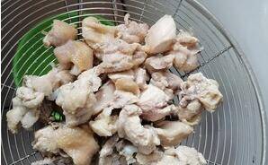 2、鸡腿肉切丁洗净,焯水捞出沥干水分。