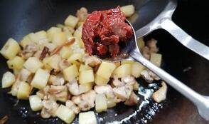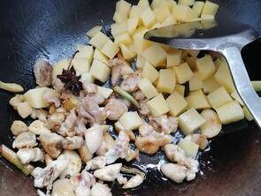 4、锅热将葱、姜、蒜、八角、花椒炒香,下鸡肉、土豆炒干水气。