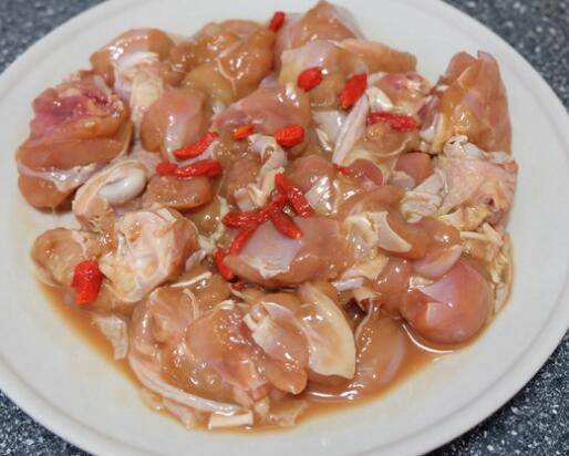 2、鸡腿肉切小块洗净,加入蒜粒、姜、生抽、盐、十三香、生粉均匀搅拌,腌制15分钟。